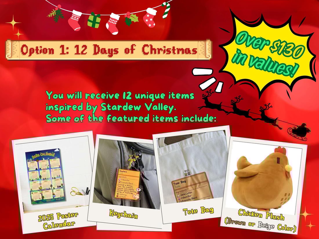 - ⭐ 12 Days of Christmas: Includes 12 unique, high-quality items valued at over $130! You’ll find a mix of handcrafted goodies, from adorable keychains to tote bags to Stardew Valley chicken plush; each individually wrapped and labeled for an exciting countdown to Christmas.
