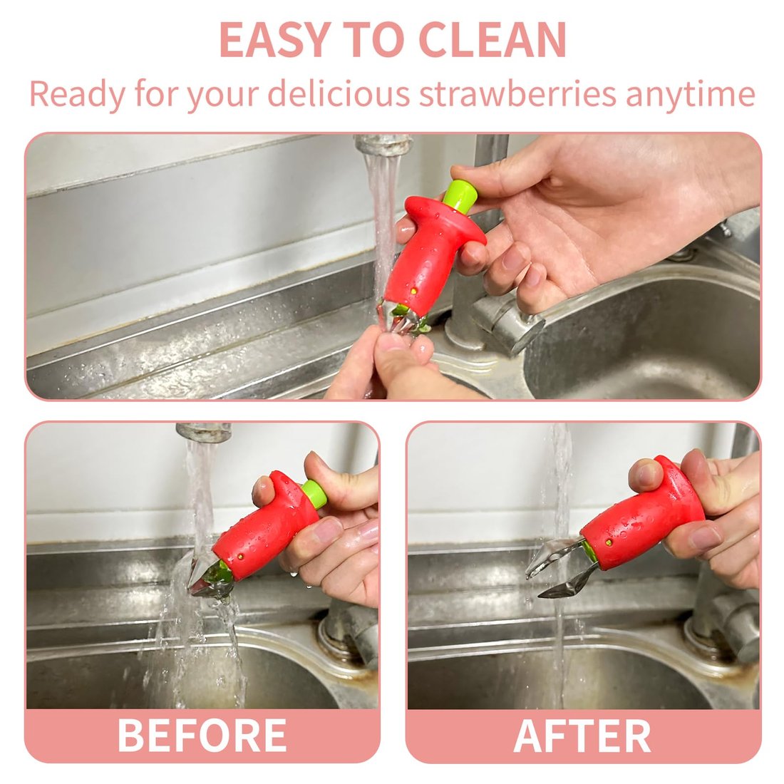 Easy to Clean: The strawberry stem remover has no dead corners, and the juice is not difficult to clean after use. Just rinse with water to clean it.