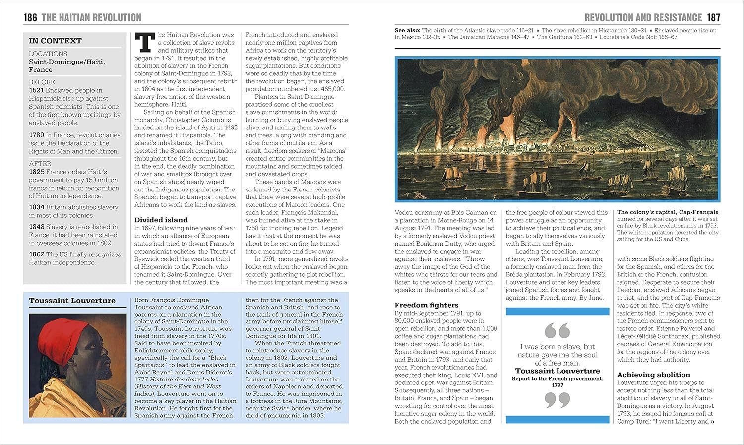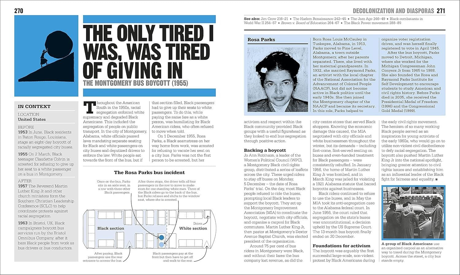Powerful images and innovative infographics bring to life the stories of the early kingdoms of Ancient Egypt and Nubia; the powerful empires of the Medieval and Early Modern eras; and the struggle against European colonizers. Black history beyond the African continent is also explored in detail - including the Atlantic Slave Trade and slave resistance settlements; the Harlem Renaissance and Jazz Age; the "Windrush" migration; Civil Rights and Black feminist movements; and Black Lives Matter.