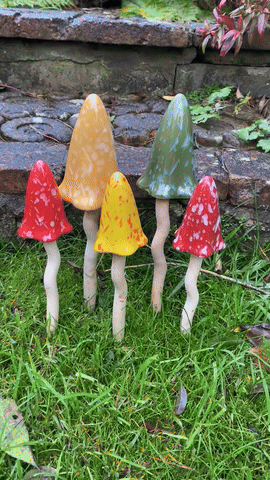 Bring vibrant colour to your garden or home with this charming set of five Timeless Toadstools, each featuring glossy summer shades that add a cheerful pop of colour.
