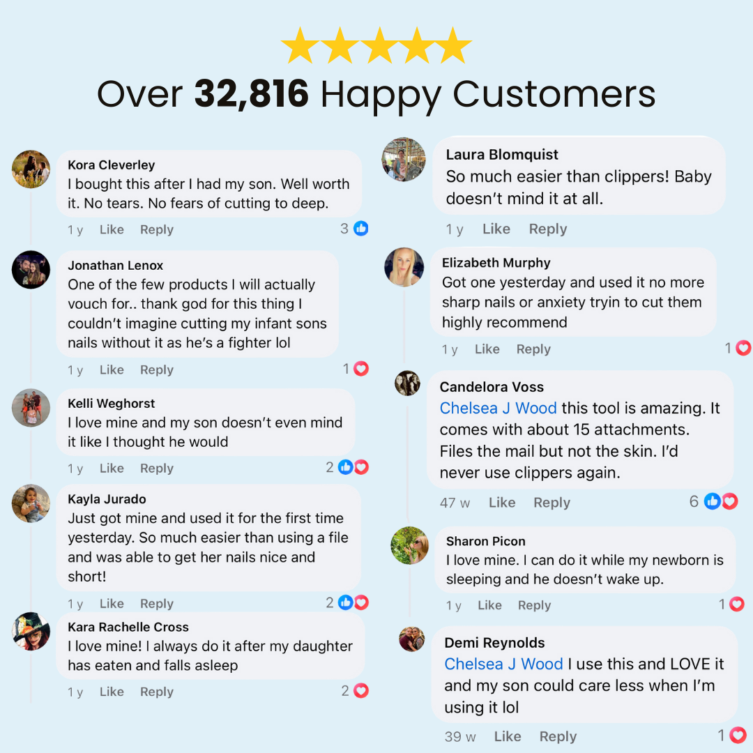 Our nail trimmer offers a painless alternative to traditional nail clippers. No more worrying about accidental cuts or discomfort caused by sharp edges. The soft and rounded filing head gently trims your baby's nails, ensuring a smooth finish every time.