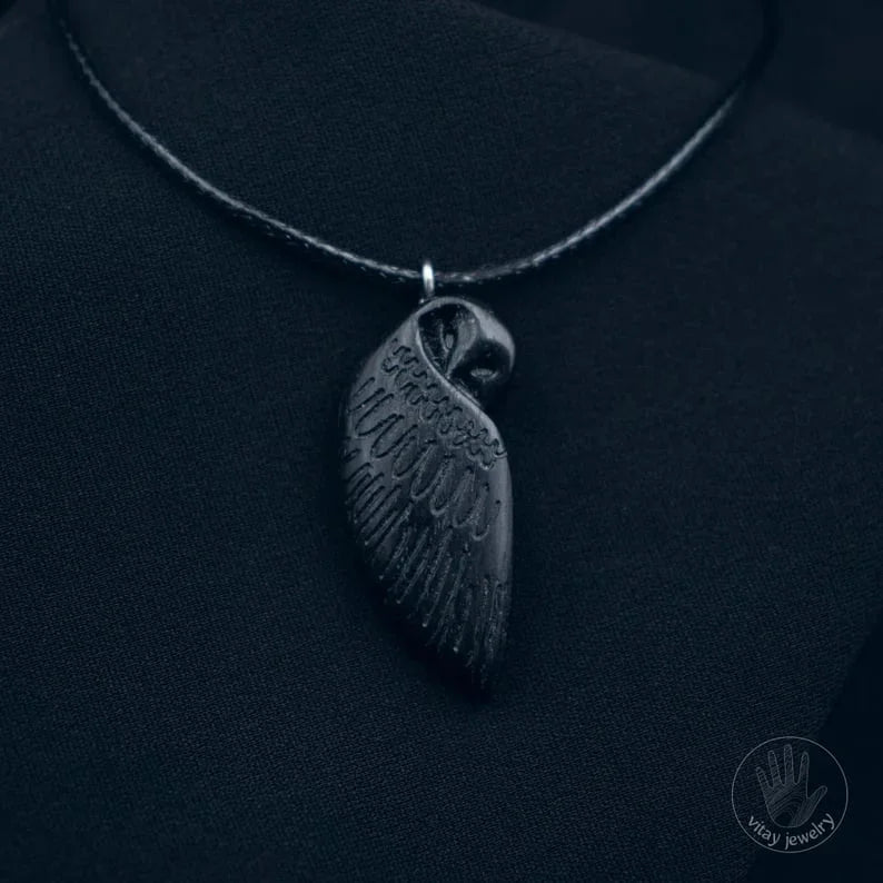 This beautiful owl necklace features a black and white wing-inspired design with the face of an owl, signifying guardianship and companionship.